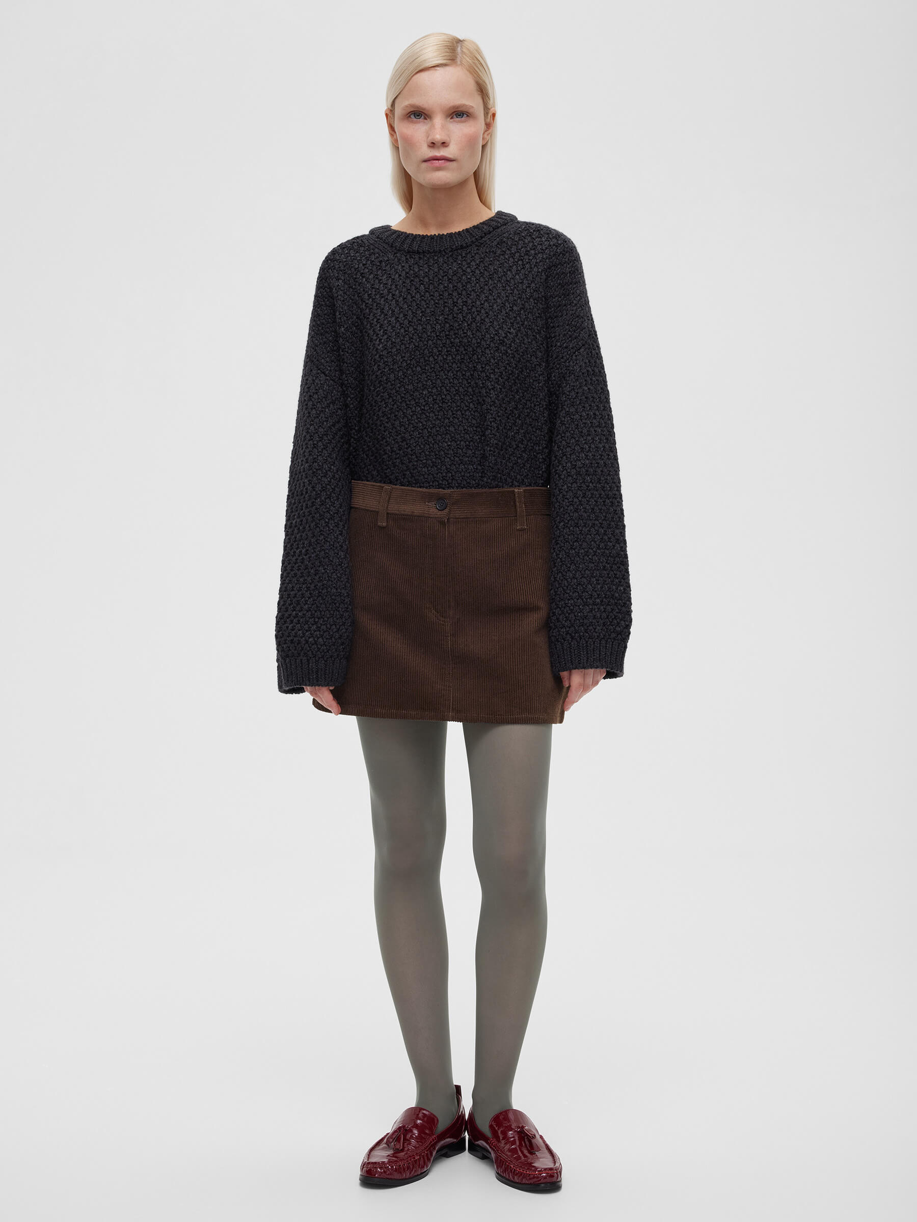 Базовая полосатая рубашка, насыщенный бордовый джемпер и мини-юбка из вельвета создают элегантный и женственный образ, подходящий как для особых встреч, так и для непринужденных прогулок