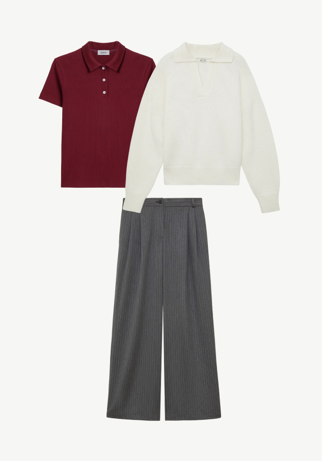 Трикотажное поло насыщенного оттенка добавляет образу характер, а молочный джемпер и серые брюки поддерживают ощущение баланса. Образ для рабочих дней, где важны фокус и уверенность, но не требуется жёсткий дресс-код — современный офис в его самом комфортном проявлении.