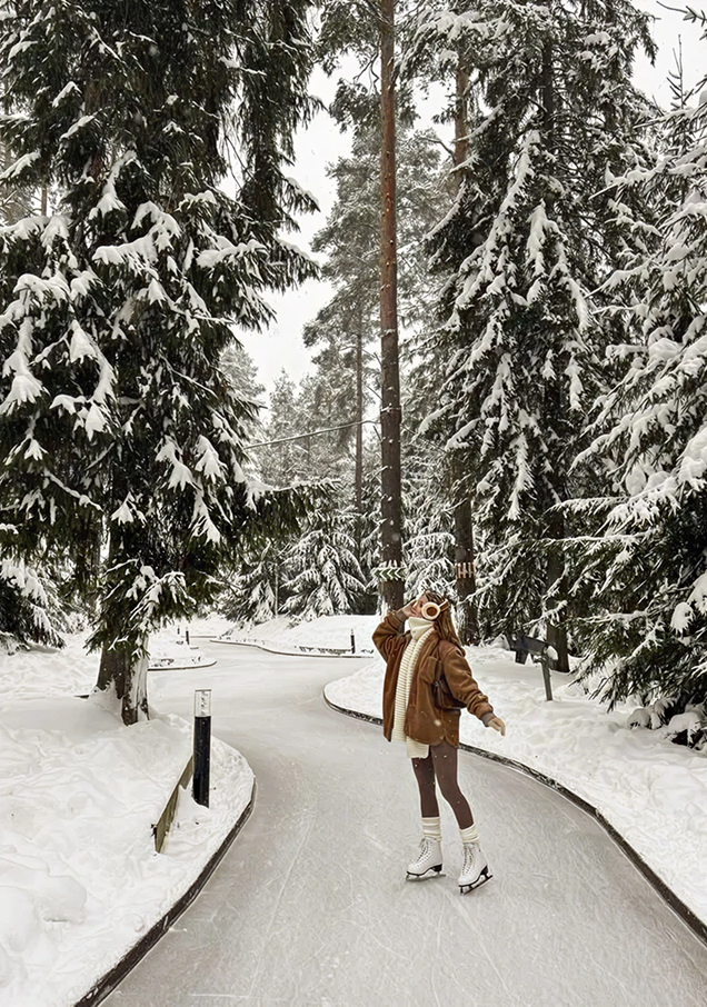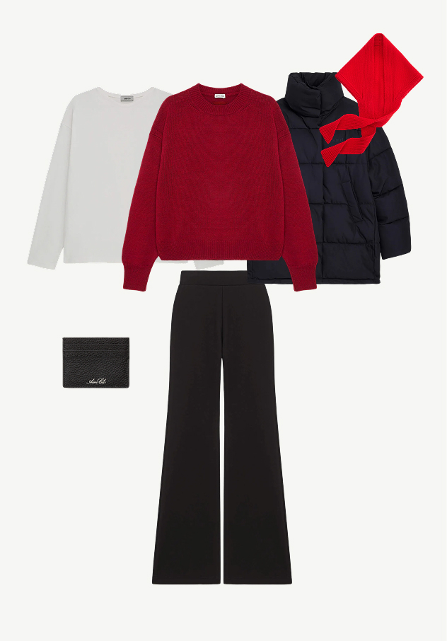 Здесь образ работает на тепло и движение. Слои, плотный трикотаж, уверенная форма — всё продумано для холодного воздуха и активного дня. Яркий пуховик работает как классный цветовой акцент, а прямые брюки удерживают образ собранным Это про радость простых вещей: снег под ногами, румянец на щеках и ощущение настоящей зимы.