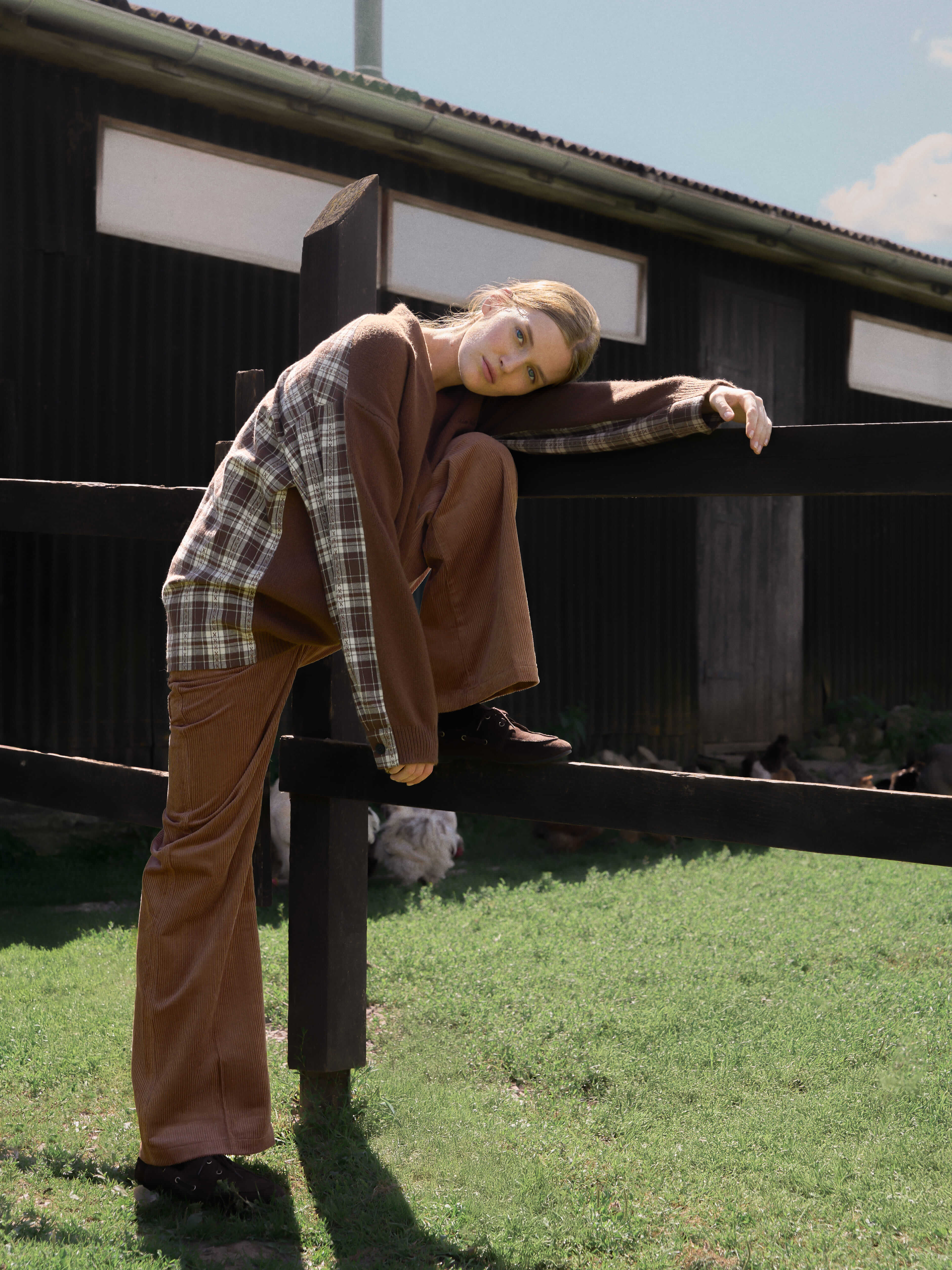 Плотный трикотаж спокойного зелёного оттенка и пальто создают ощущение покоя и уединения. Слои мягко работают вместе, не утяжеляя образ, а чёрный деним задаёт уверенную, спокойную основу. Вещи для дней за городом — когда хочется тепла и ощущения, что спешить никуда не нужно.