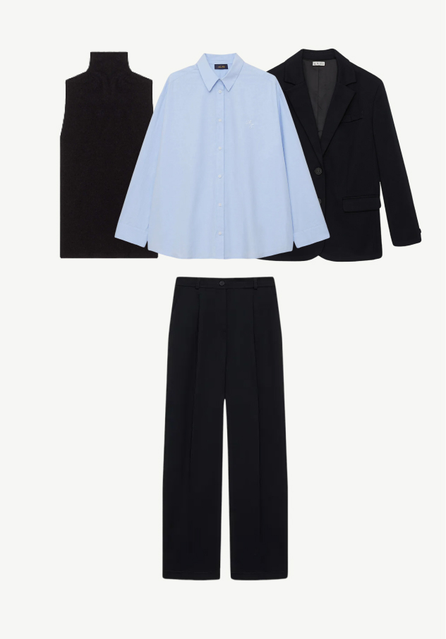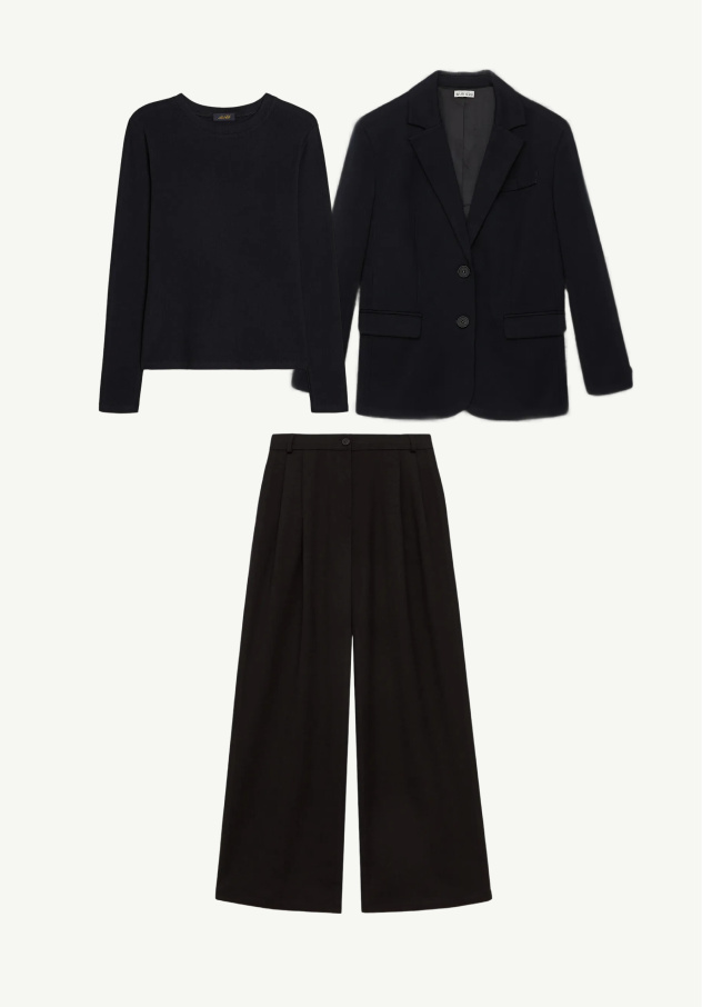 Образ от основателя бренда Нины. Обожаю этот образ, когда нужно чувствовать себя на все сто. Строгий двубортный жакет сразу собирает и задаёт тон, под ним — невесомый лонгслив, в котором комфортно весь день, а широкие брюки с защипами добавляют движения и свободы. Именно то, что нужно для длинного рабочего дня и важных встреч.