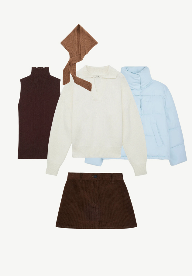 Нежный и романтичный наряд для свидания: мини-юбка подчеркнёт женственность и обеспечит свободу движений, а трикотажный топ в сочетании с джемпером-поло добавит лёгкости образу. Куртка цвета неба защитит от холода, а косынка из шерсти станет завершающим штрихом.
