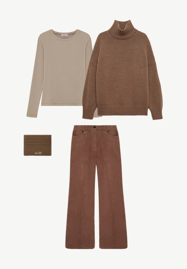 Для встречи с друзьями, будь то поход в гости или вечер в кафе, этот образ станет отличным выбором: воздушный свитер крупной вязки цвета кофе с молоком, серо-бежевый лонгслив в качестве второго слоя и брюки клёш из вельвета в цвете горький шоколад. Завершит наряд минималистичный кожаный картхолдер, который будет не только стильным, но и практичным аксессуаром.